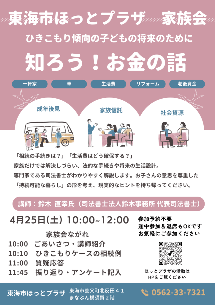 東海市ほっとプラザ家族会は愛知県東海市にお住まいで、ひきこもり・不登校の傾向や状態にある家族を持つ方のための集まりです。