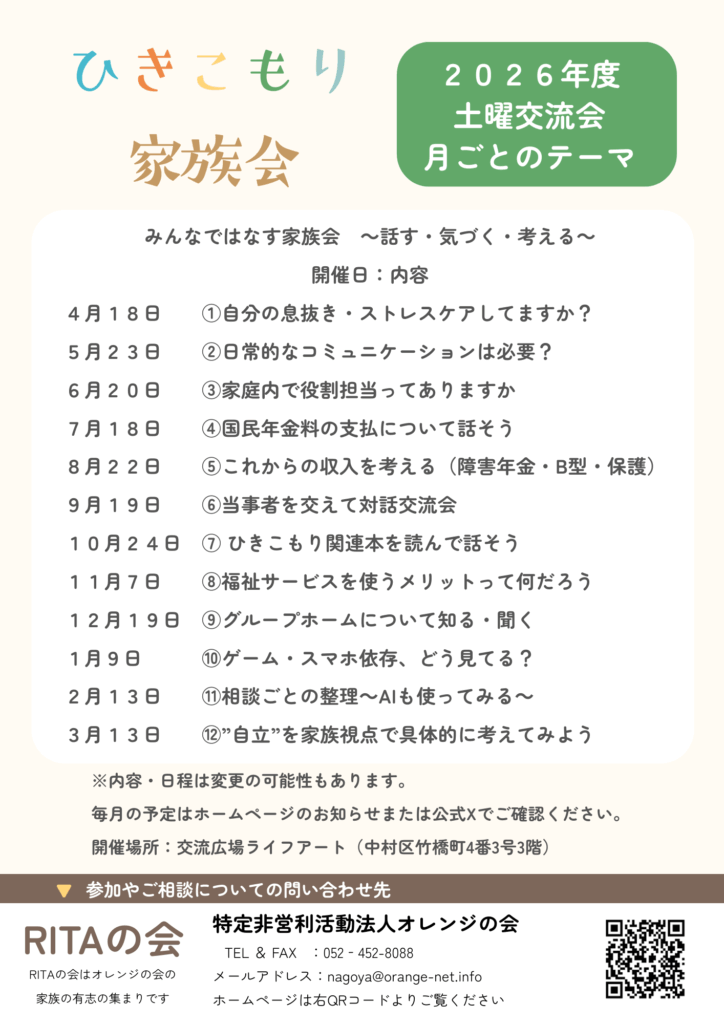日程・スケジュールは変更の場合もございますので、開催の予定はオレンジの会 RITAの会告知ページ